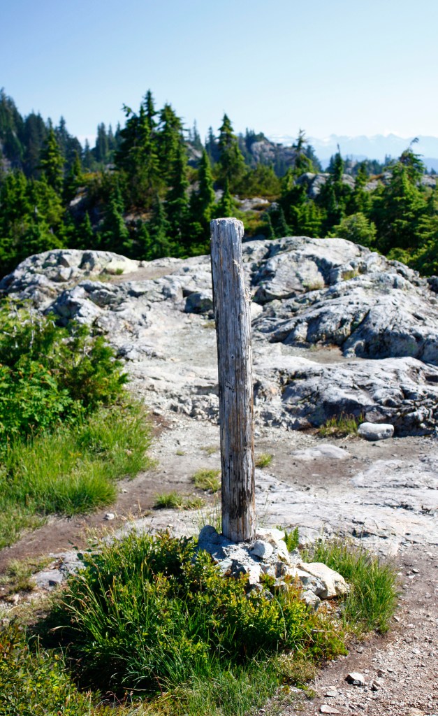Once you’ve checked out the views at First Peak continue back to the main trail for about 750 m to Tim Jones Peak, named after a former member of the North Shore Search and Rescue Team (previously known as Second Peak). You will pass the small pond on the way to and from First Peak.