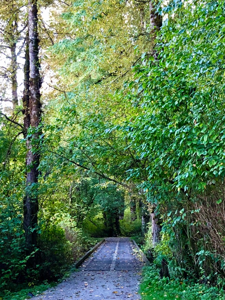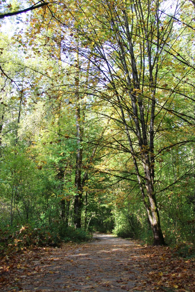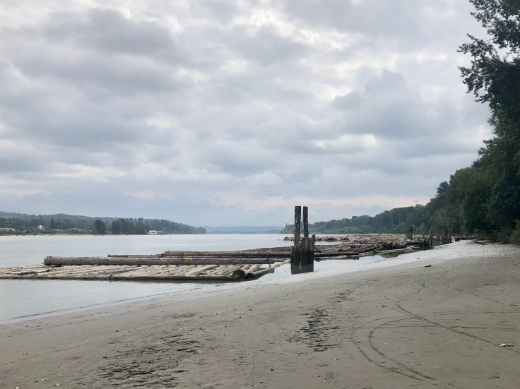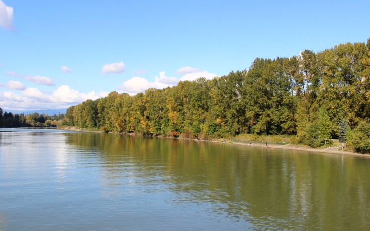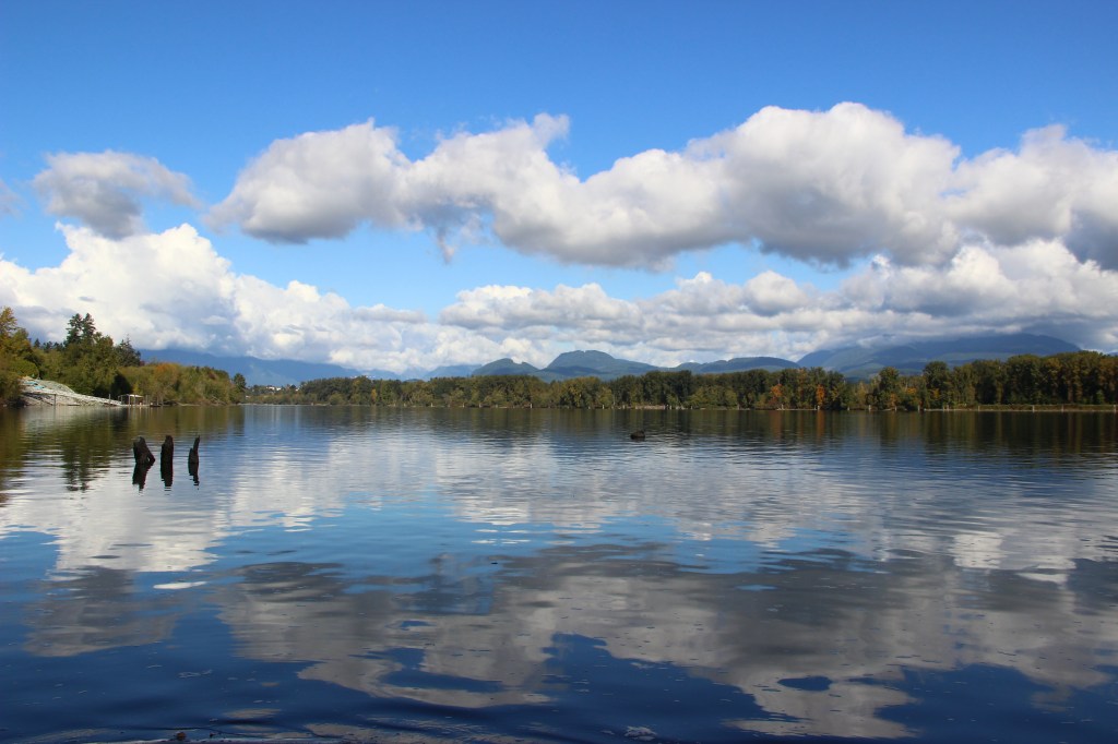 If you continue on the trail that leads straight you will soon get to Tavistock Point and a view looking west down the Fraser River. When I went in the summer it was actually a bit overcast, but returning in the autumn we had a gorgeous sunny day and the reflection of the clouds in the water was spectacular!