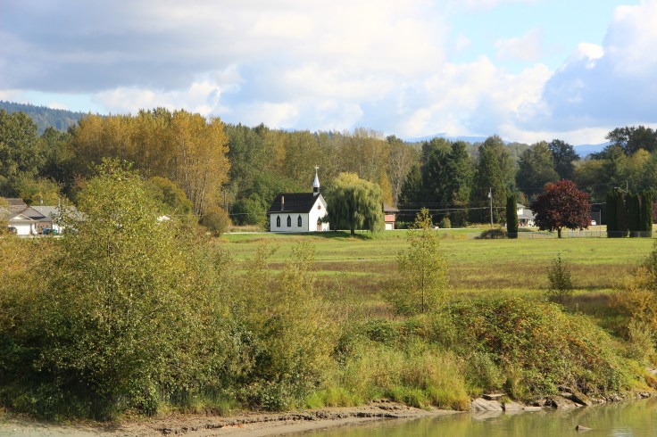 From Fort Langley head over the bridge to Brae Island. The bridge spans the Fraser River and from here you can spot the white church to the east. This is the Church of the Holy Redeemer whish is situated on land owned by the Kwantlen First Nations. Looking to the west you can see the forested area of Brae Island and the beach areas used by campers and day-use visitors.